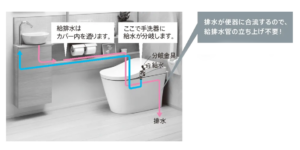 本来手洗い器を新設する場合、違う場所から給排水管を伸ばしてこないといけないのですが、ネオレストワンデーリモデルは既存のトイレの給排水管をそのまま利用できるため、工事の時間も費用も抑えることができます!