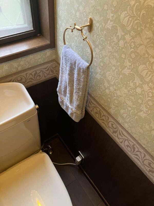 紙巻器やタオルリング、照明も一新して欧米風な雰囲気に仕上がりました。
