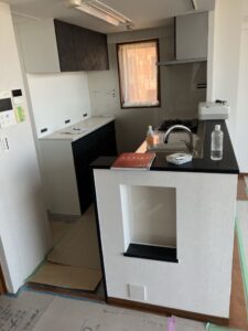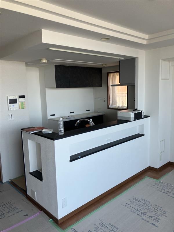 通常、カップボードを新設する場合キッチン内に圧迫感が生じますが、今回は壁を撤去した事により軽減されました!