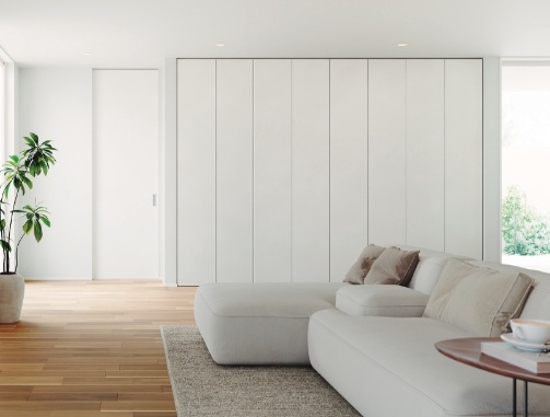 壁と扉がフラットになるよう、取手のないプッシュオープン仕様を採用。