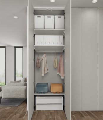 棚受けレールにブラケットを差し込むだけで、自由に棚板を設置できます。