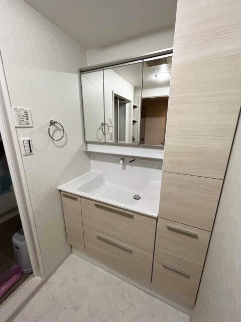 さらに収納力を高めるサイドキャビネットで小物からタオルなどの大型までしっかりと収納できます。